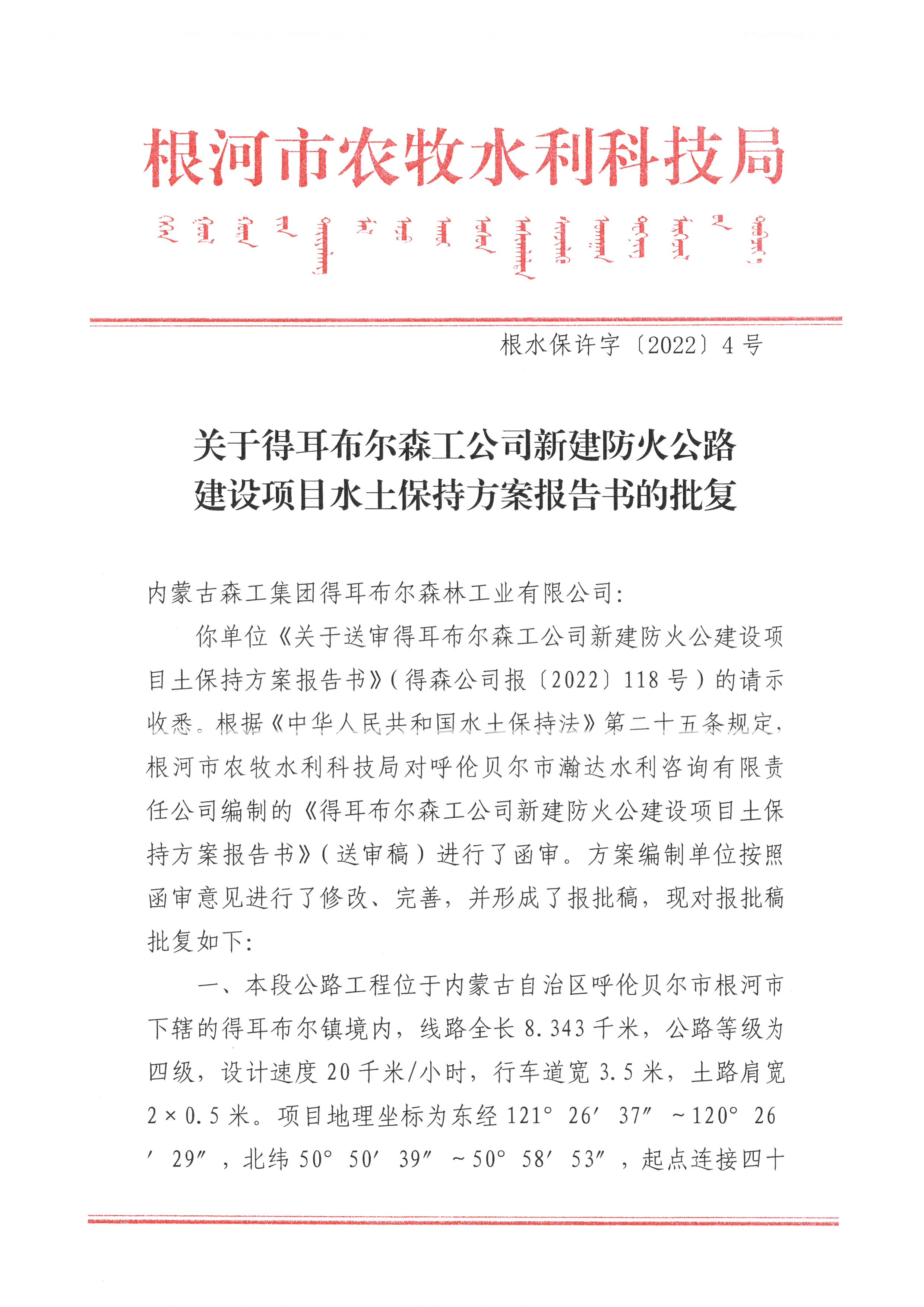关于得耳布尔森工公司新建防火公路建设项目水土保持方案报告书的批复