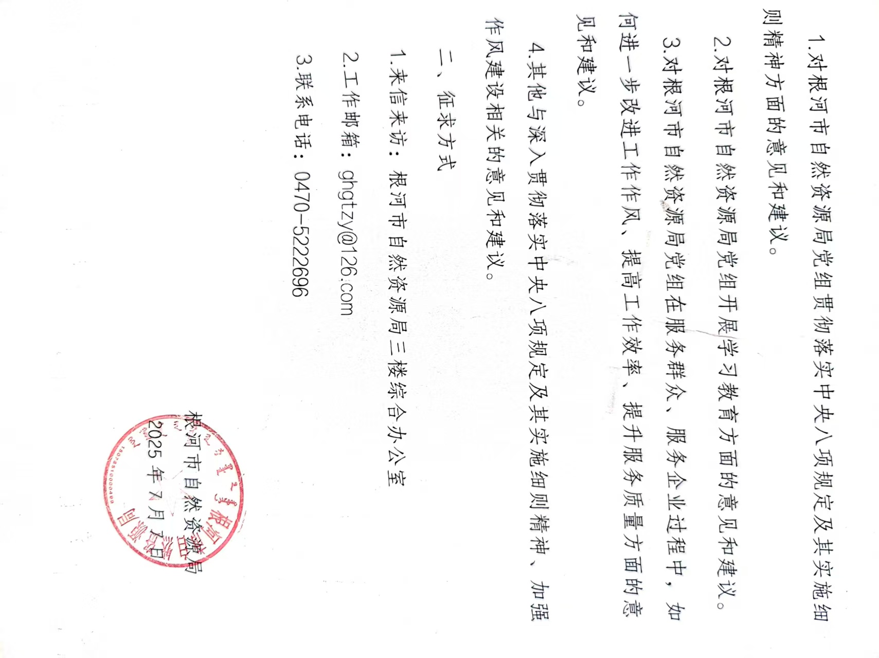 UedBet体育自然资源局党组关于征求深入贯彻中央八项规定精神学习教育意见建议的公告